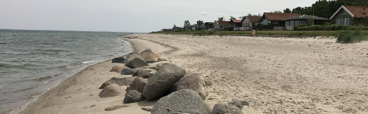 Stranden er en fin bred strand, der udgøres af fint sand. Langs med stranden er der opført tværgående høfder af store sten, der også pryder stranden langs med diget.