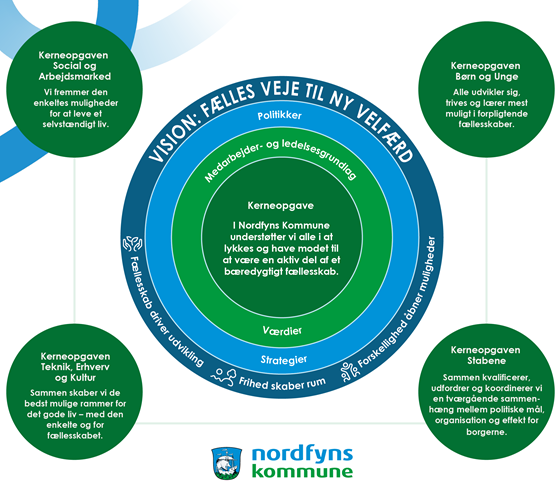 I Nordfyns Kommune ønsker vi at skabe de bedste rammer for borgere, virksomheder og foreninger, samt for kommunens ansatte. Én måde at skabe disse gode rammer, er at arbejde kontinuerligt med at kende og forstå sin kerneopgave. Når vi kender vores kerneopgave, så har vi en fælles forståelse af hvad vi hver især bidrager til, med hver vores faglighed, for at skabe værdi for og med borgerne i Nordfyns Kommune.